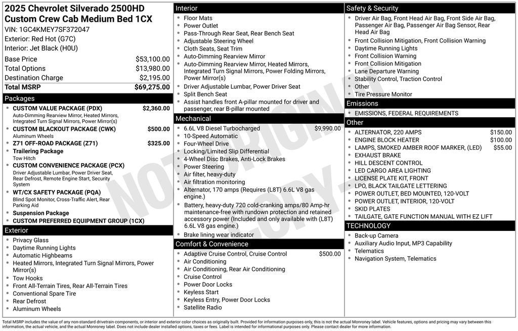 Red Hot 2025 Chevrolet Silverado 2500HD Custom 4WD 10-Speed Automatic Duramax 6.6L V8 Turbodiesel 10-Speed Automatic, 4WD, Black Cloth.